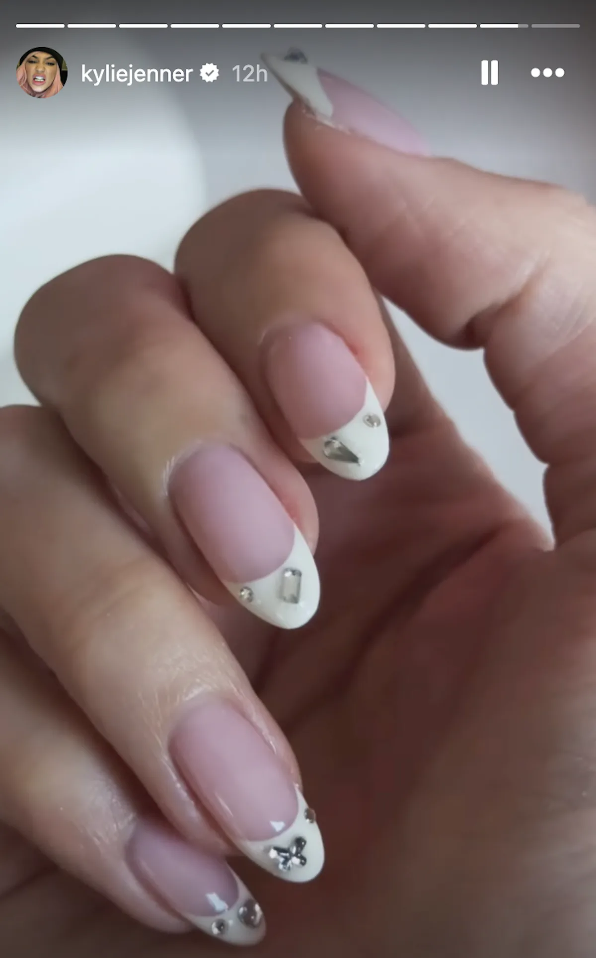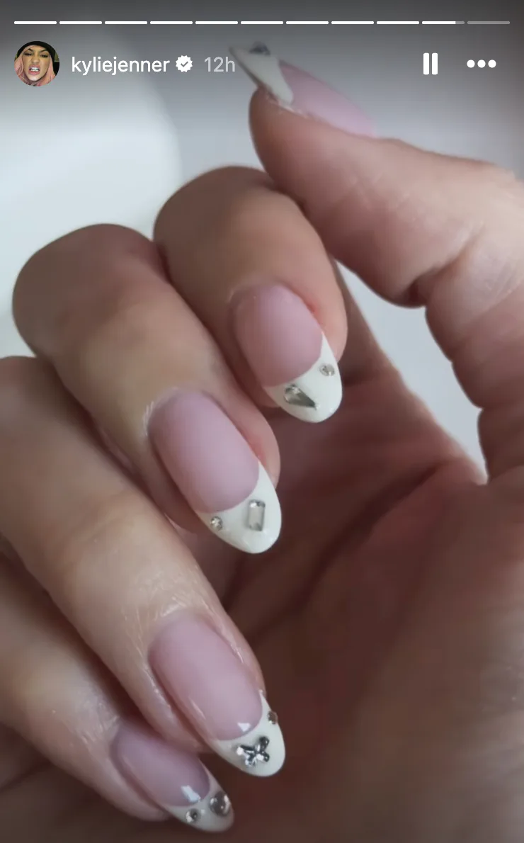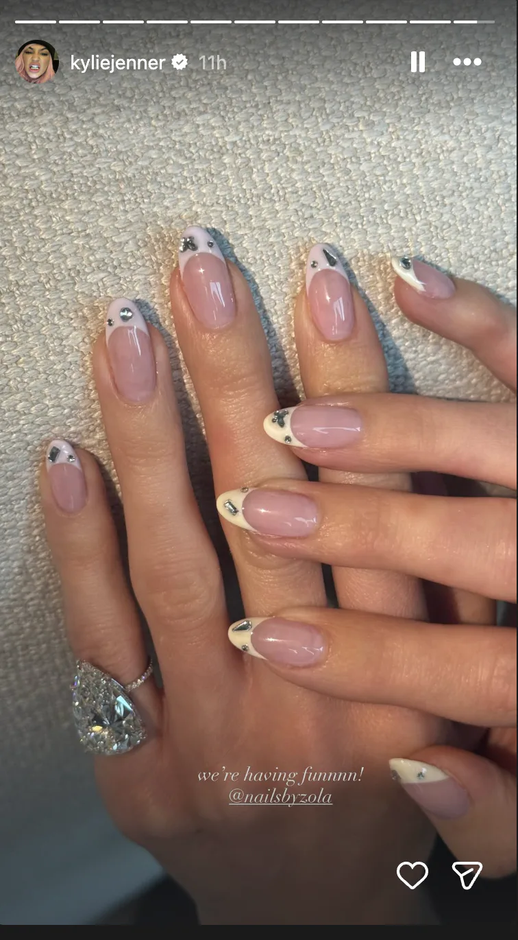 Shared on Jenner’s Instagram stories as both a video and a photo, the medium-length almond set features the classic pinky-nude base with crisp white half-moons. Each tip is topped with a smattering of silvery-clear gemstones; studs, rectangles, even a few bows. The nails are credited to Jenner’s longtime collaborator, celebrity manicurist Zola Ganzorigt.